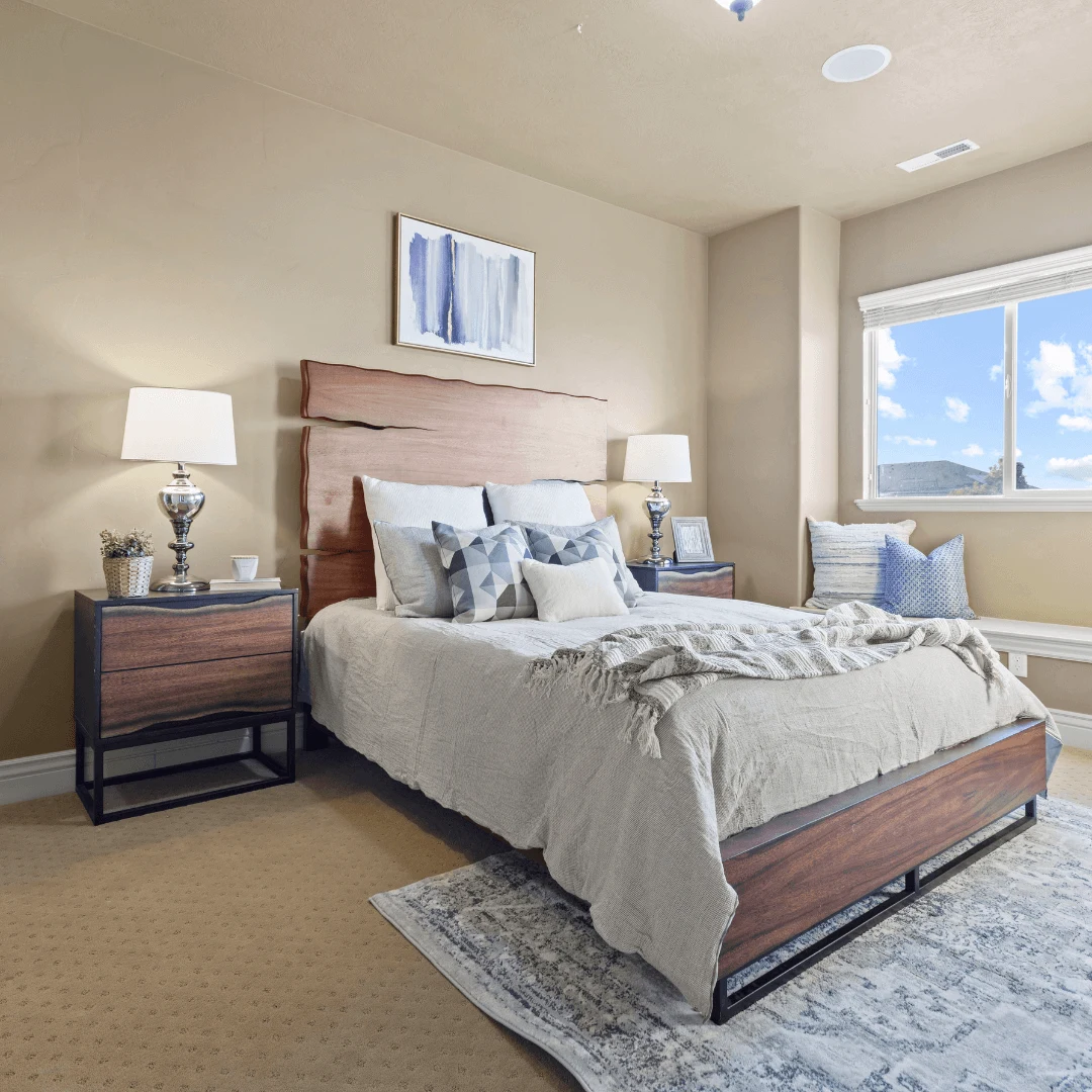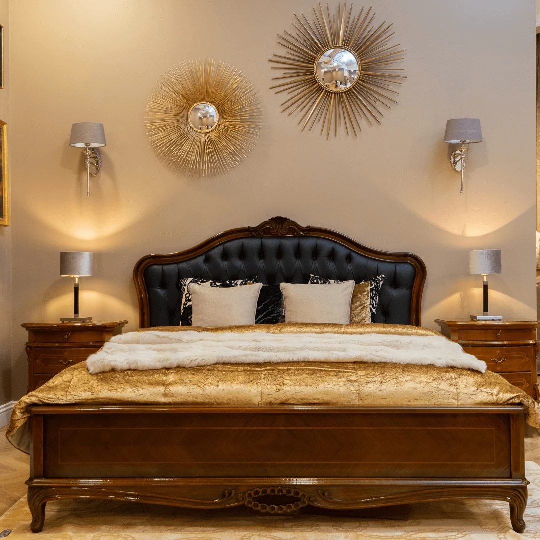 Elegant Bedroom with Wooden Furniture and Subtle Marble Highlights.