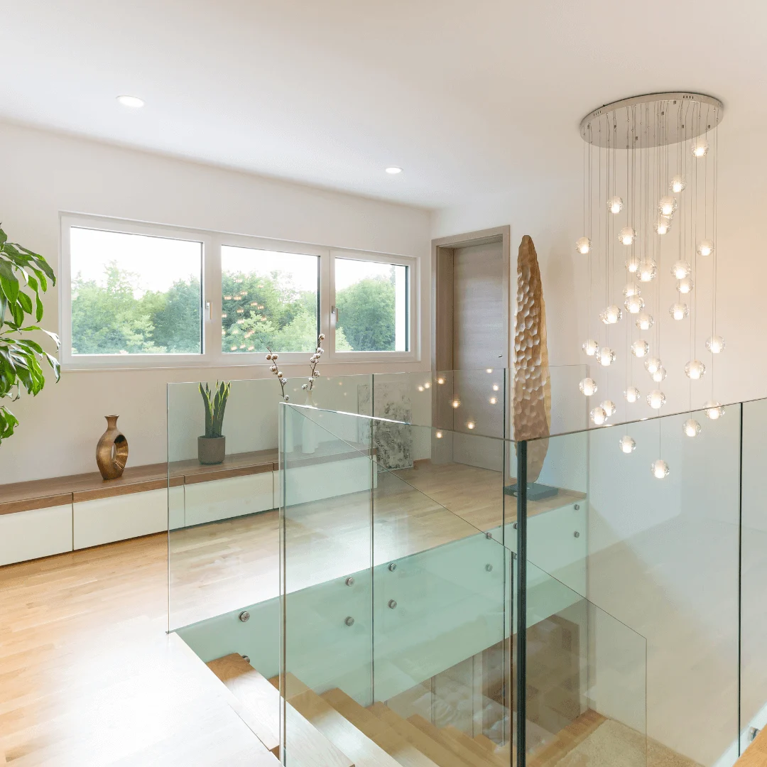 Wooden Beam Ceiling with LED Strips and Warm Finish