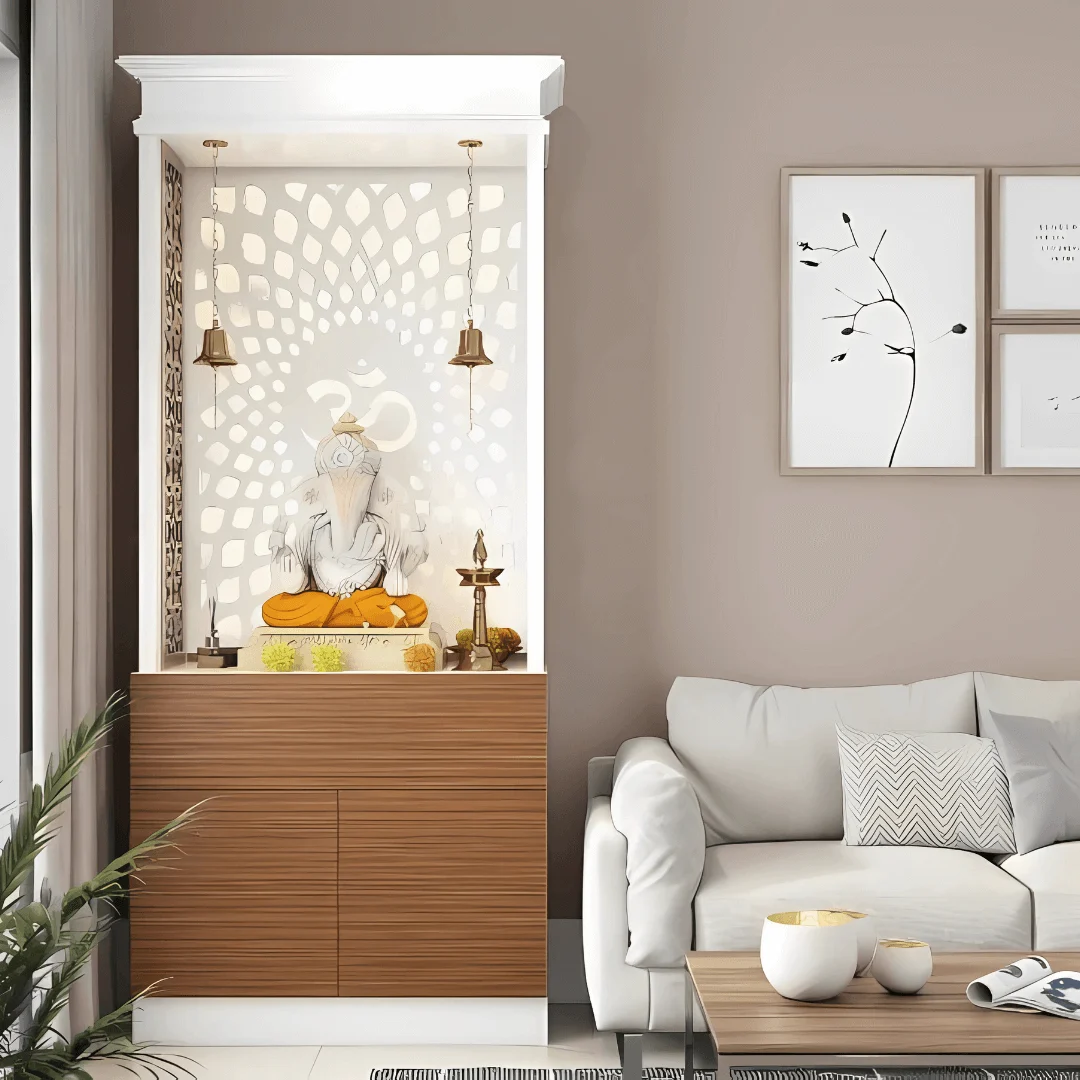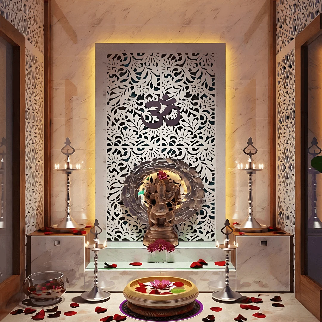 Modern Pooja Unit with Backlit Panel and Intricate Jaali Work