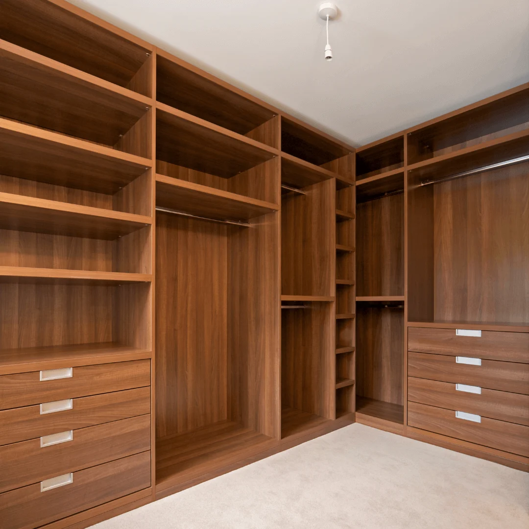 Walnut Finish Wardrobe with Sliding Doors and Open Shelves