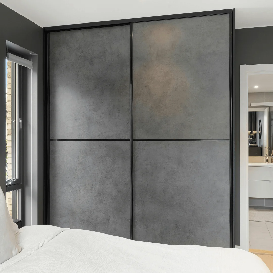 Minimalist Grey Wardrobe with Vertical Handles and Soft Lighting Inside